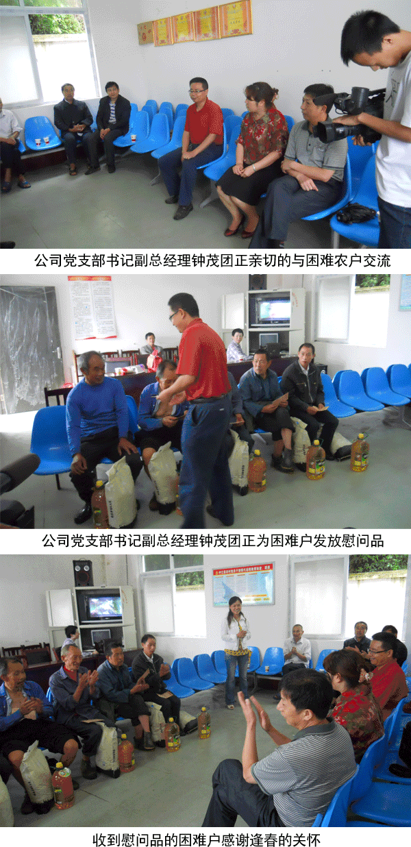 6月27日,公司黨支部書記副總經(jīng)理鐘茂團(tuán)、黨支部副書記謝揚(yáng)林及支部部份黨員代表與縣委統(tǒng)戰(zhàn)部辦公室主任張小勇、縣工商聯(lián)副會(huì)長唐素瓊等領(lǐng)導(dǎo)一道,冒雨來到中國芍藥之鄉(xiāng)的核心區(qū)――中江縣集鳳鎮(zhèn)石埡子村,在集鳳鎮(zhèn)領(lǐng)導(dǎo)和石埡子村領(lǐng)導(dǎo)的帶領(lǐng)下,慰問了該村部份困難群眾,給五戶困難群眾各送去了400元現(xiàn)金和一桶食用油、一袋大米,送去了逢春制藥董事長黎勇先生以及公司全體黨員對困難群眾的關(guān)懷之情。